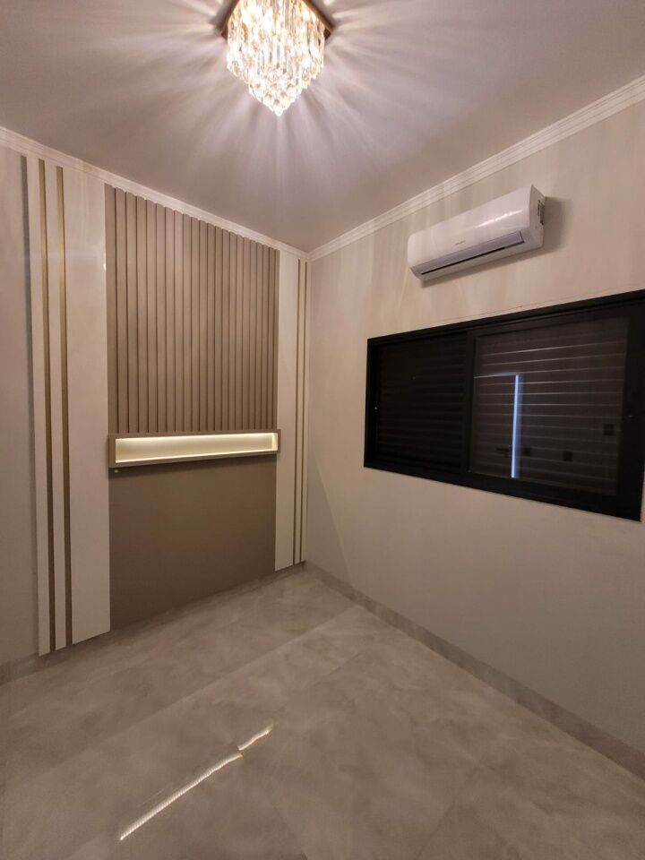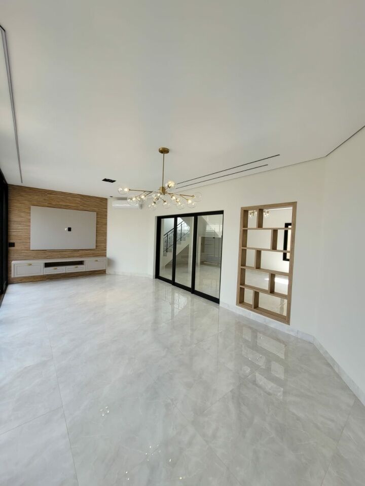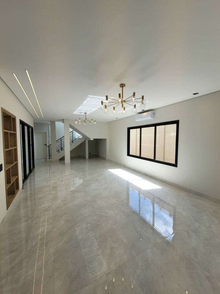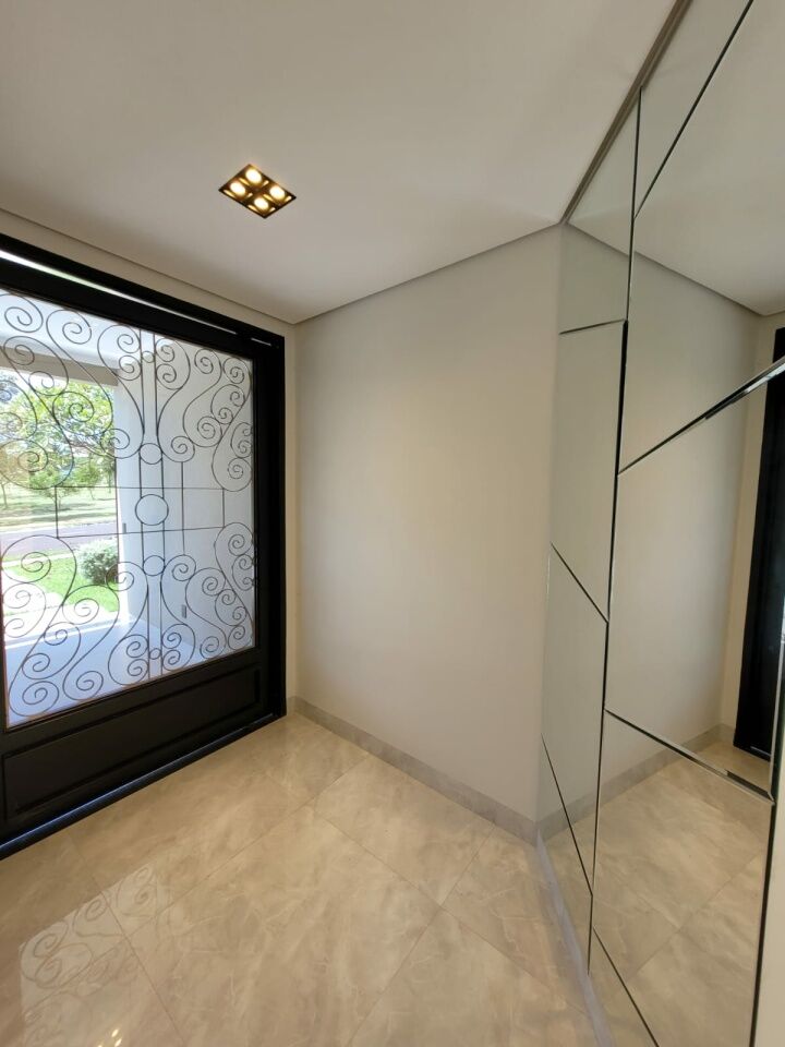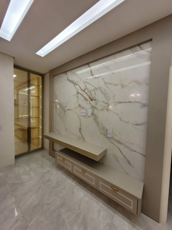 No térreo, o imóvel conta com lavabo, duas amplas salas de estar climatizadas e com cortinas, escritório com armário planejado, persiana e ar-condicionado, além de um home privativo com painel e ar.