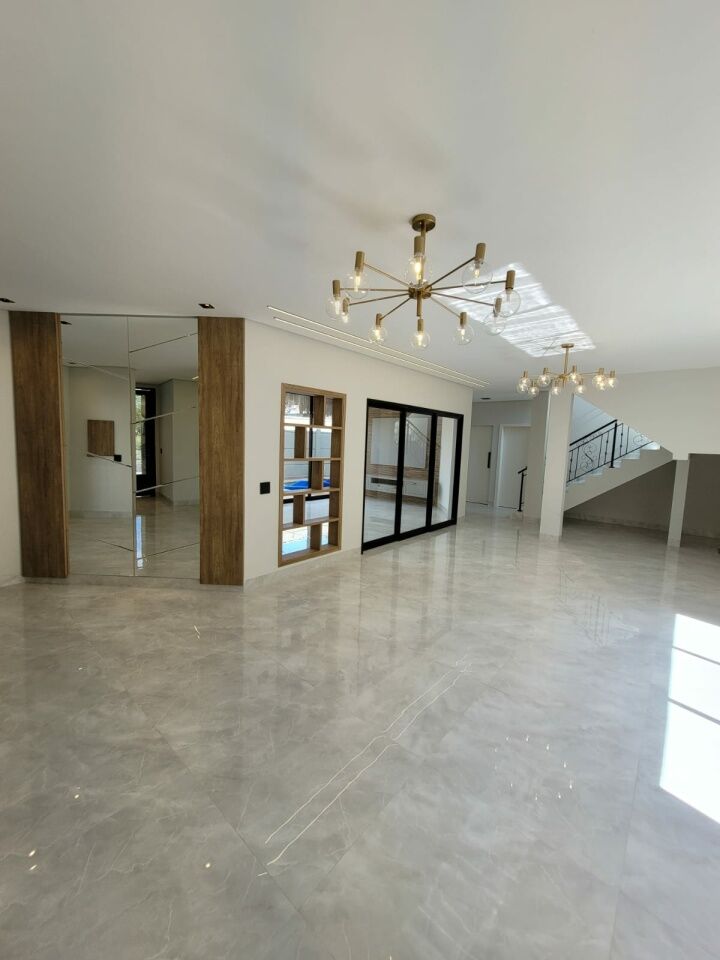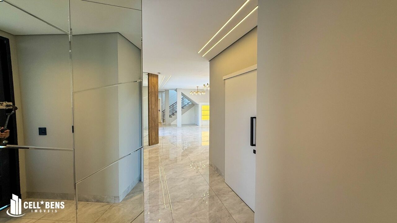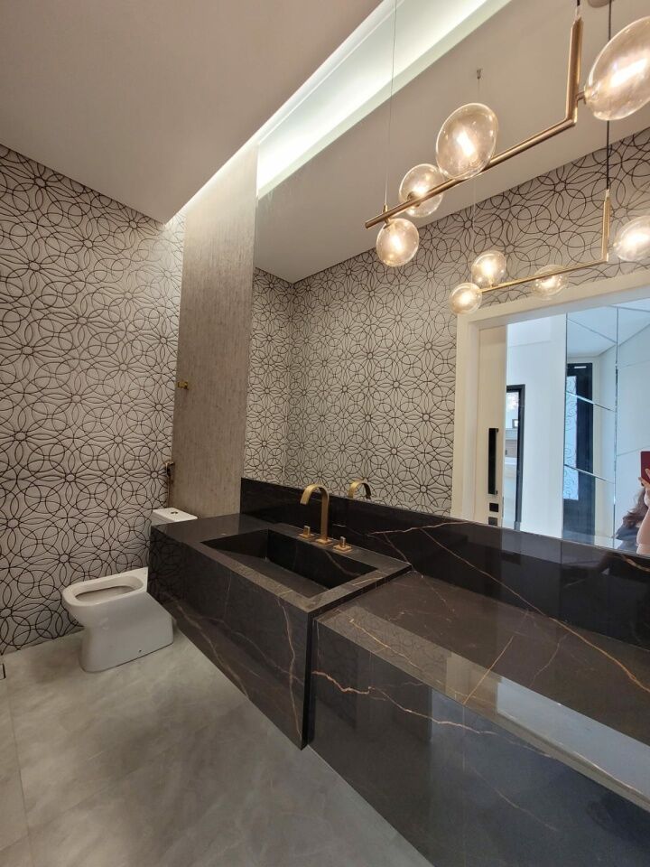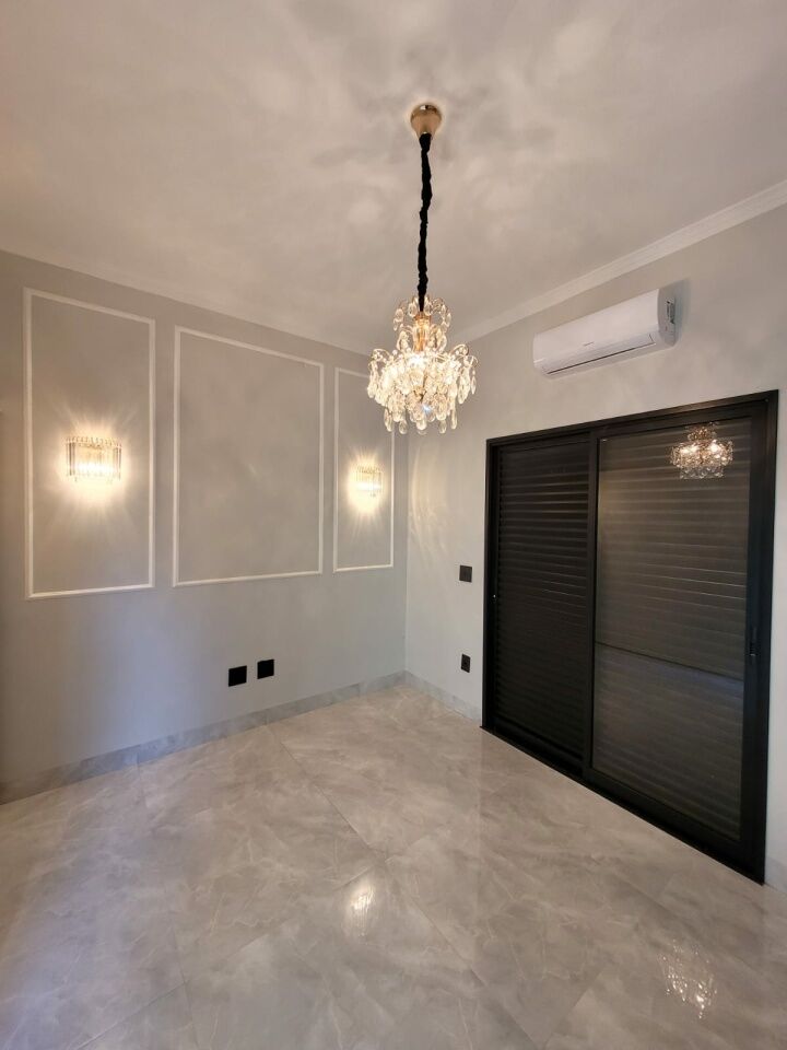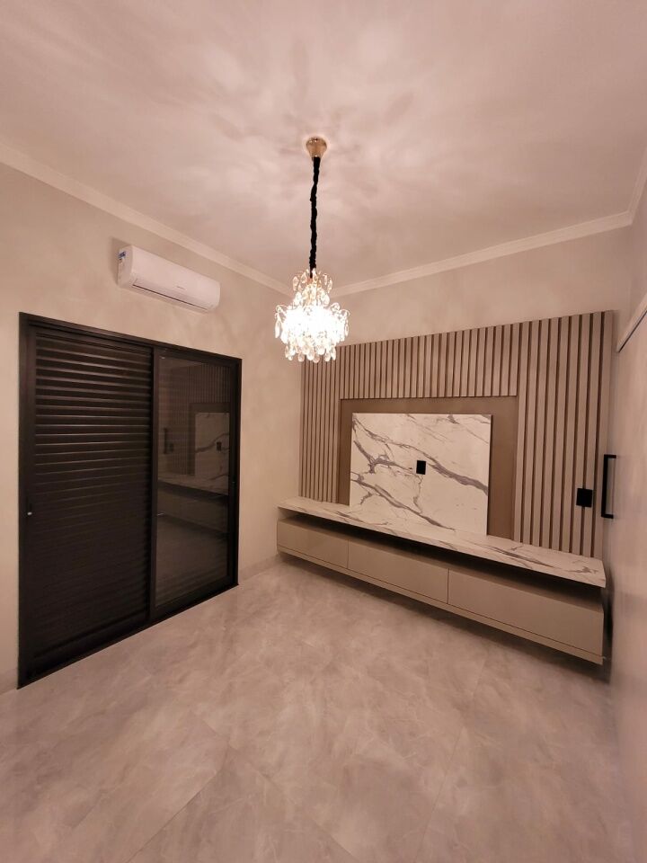 No térreo, o imóvel conta com lavabo, duas amplas salas de estar climatizadas e com cortinas, escritório com armário planejado, persiana e ar-condicionado, além de um home privativo com painel e ar.