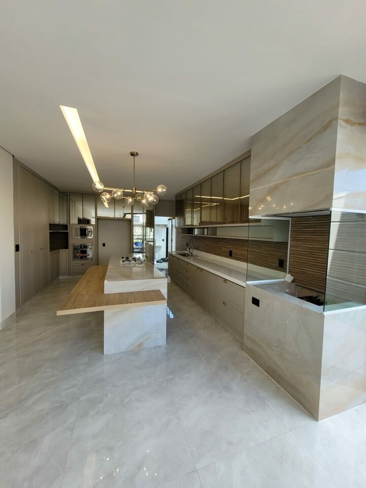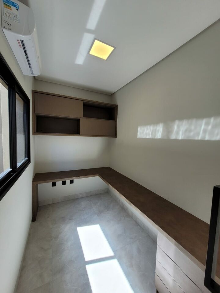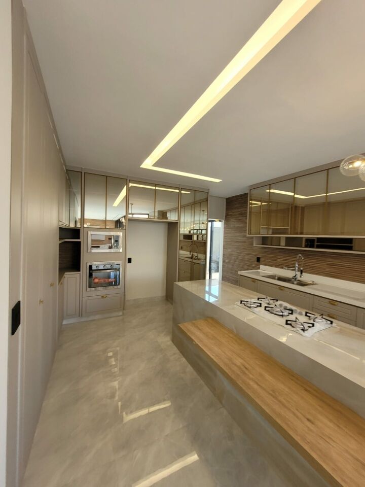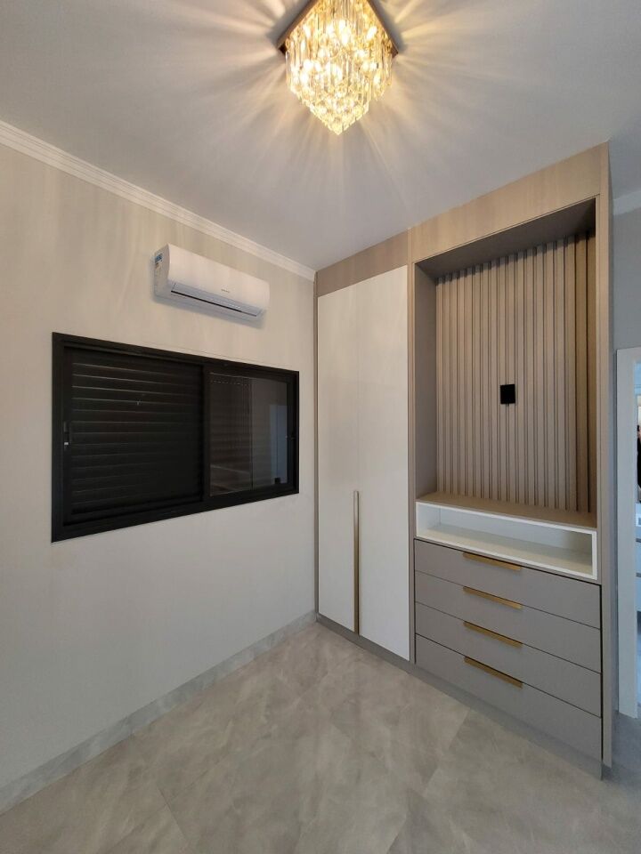A cozinha é completa, rica em armários e com iluminação em LED, equipada com micro-ondas, cooktop, coifa, balcão refrigerado e churrasqueira, integrada à sala de jantar com painel, persianas e ar-condicionado. Ainda no térreo, há um dormitório tipo suíte, com armário, painel e ar.