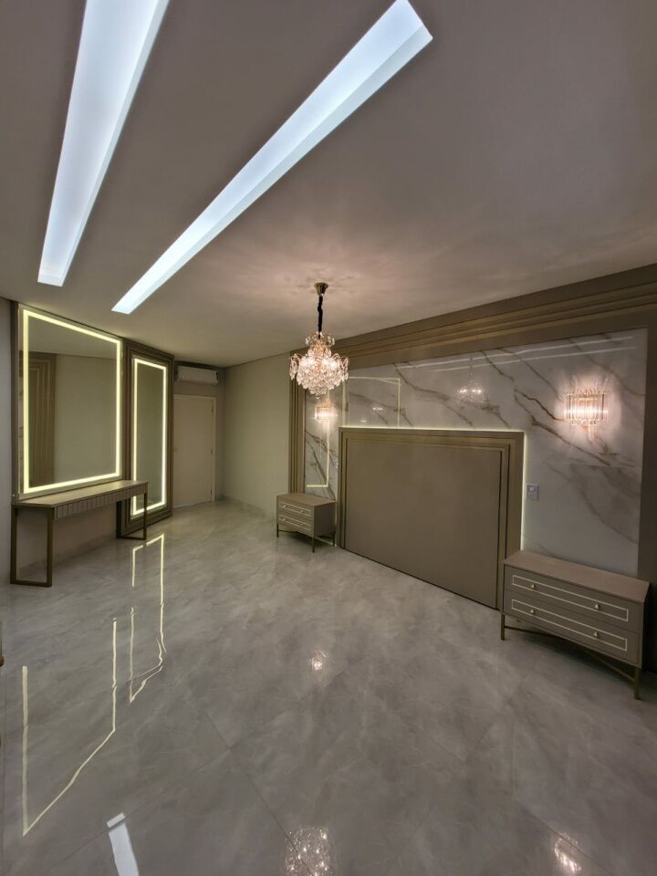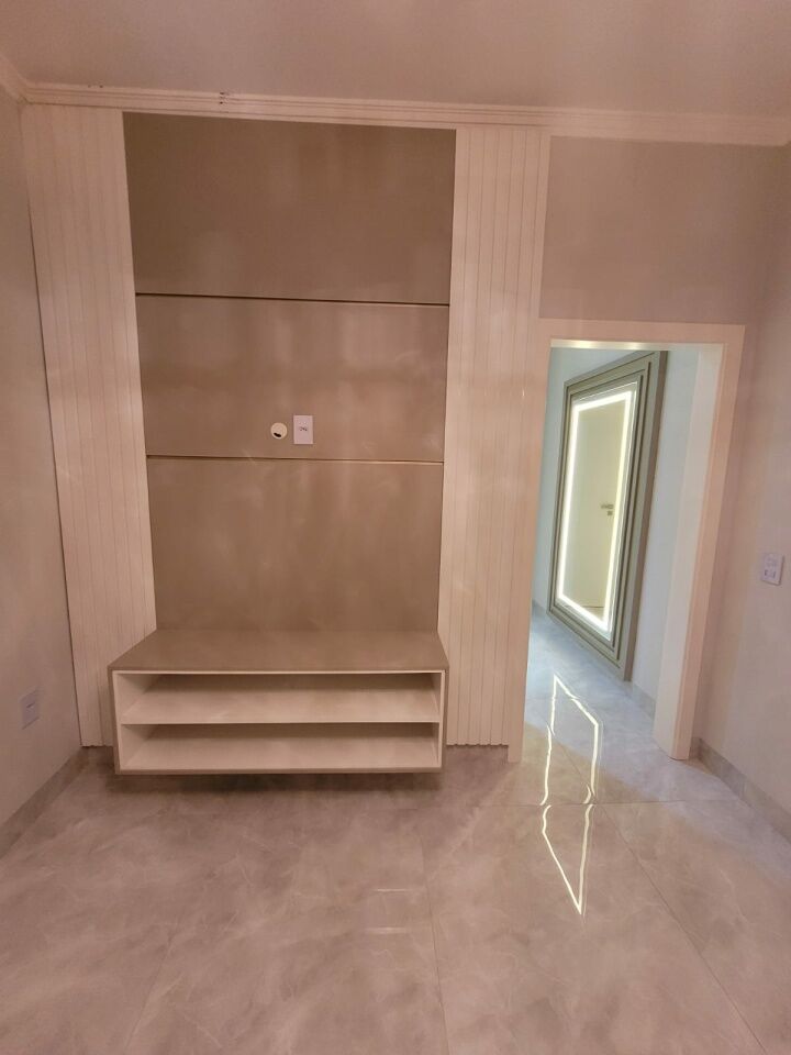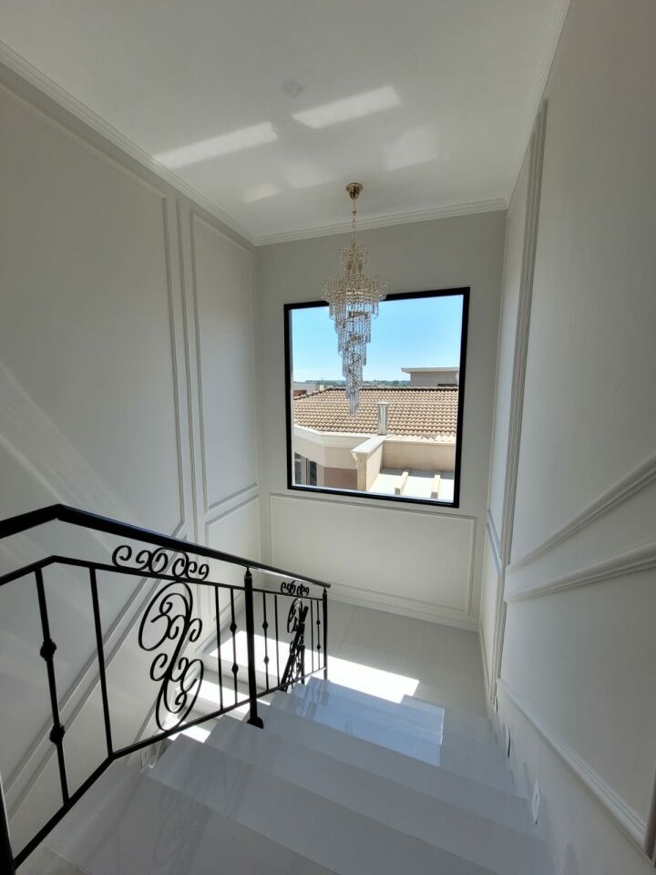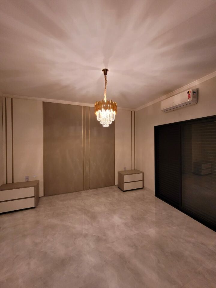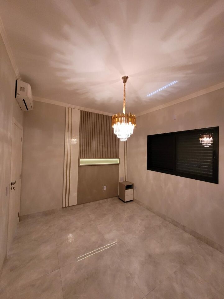 A escada possui lustre decorativo, persiana e iluminação embutida nos degraus, levando ao living superior com roupeiro e lustre. No pavimento superior, são três suítes, todas com armários planejados, espelhos com LED, cortinas e ar-condicionado ? sendo a suíte master com ampla sacada e vista para o jardim central do condomínio.