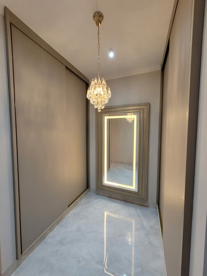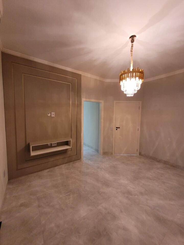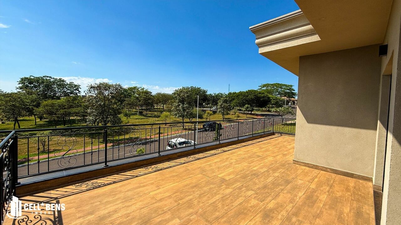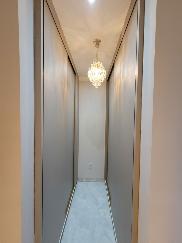 A escada possui lustre decorativo, persiana e iluminação embutida nos degraus, levando ao living superior com roupeiro e lustre. No pavimento superior, são três suítes, todas com armários planejados, espelhos com LED, cortinas e ar-condicionado ? sendo a suíte master com ampla sacada e vista para o jardim central do condomínio.